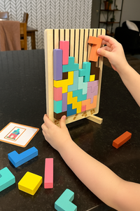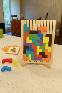 The set includes over 40 high-quality wooden puzzle blocks, a sturdy vertical playboard with base stand, and 10 double-sided challenge cards for guided play.